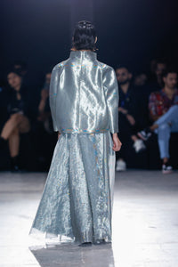 Our Aurora handloom zari silk skirt features fluid pleats in a floor-length silhouette. Woven to reveal a soft iridescence, the fabric catches light from every angle-elevating tradition with quiet brilliance.