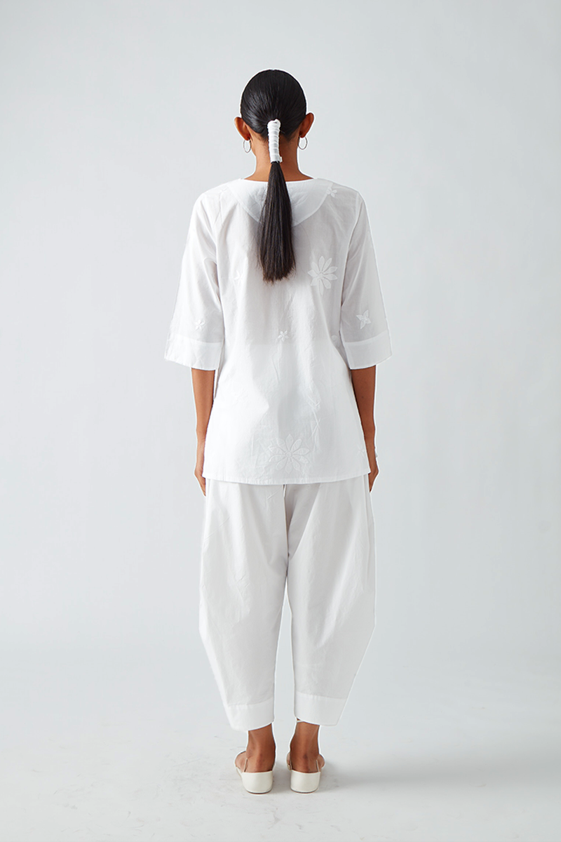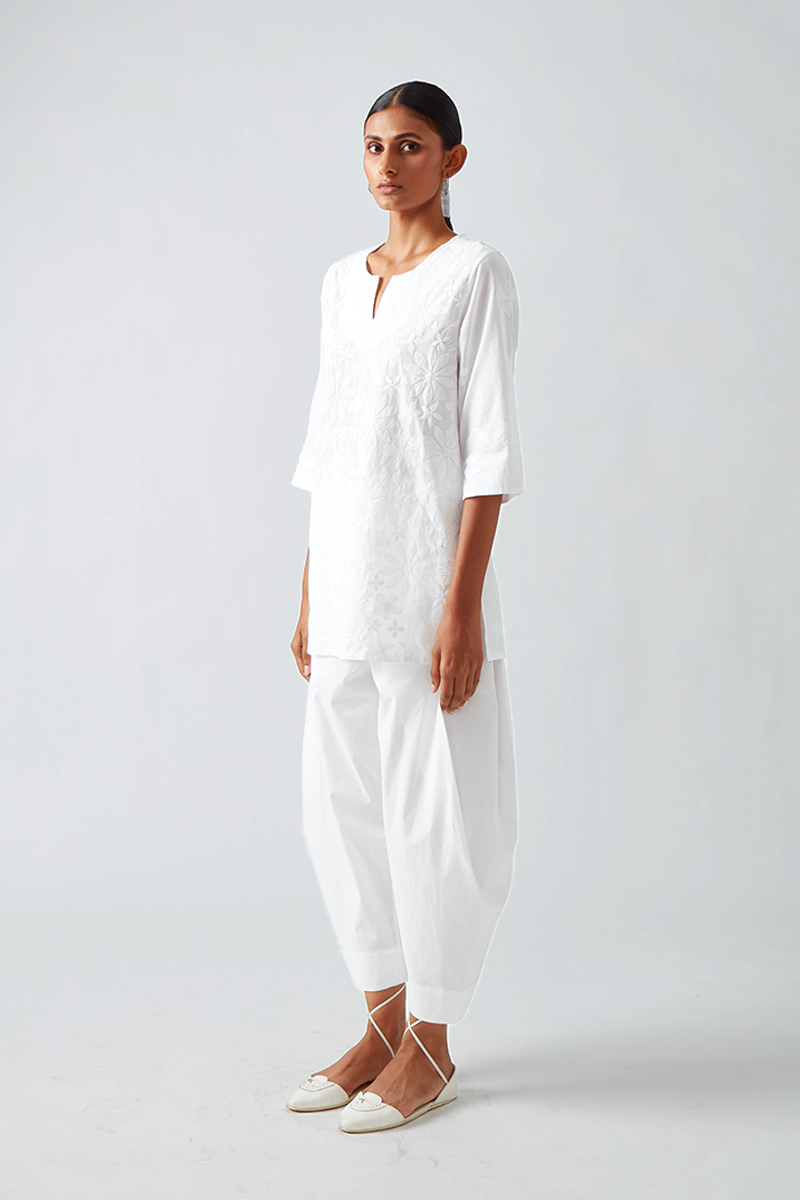 • The front is adorned with a mix of large and small chikan embroidered floral motifs, while the back and sleeves carry a few delicately spaced flowers.