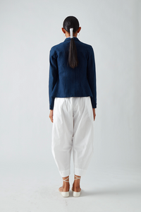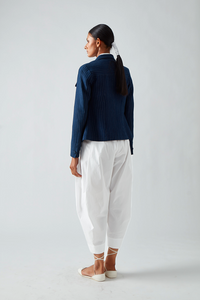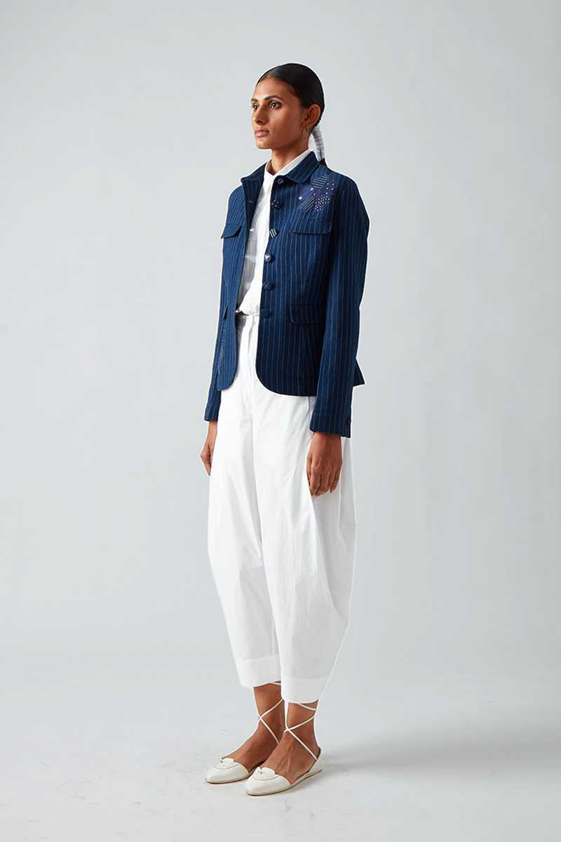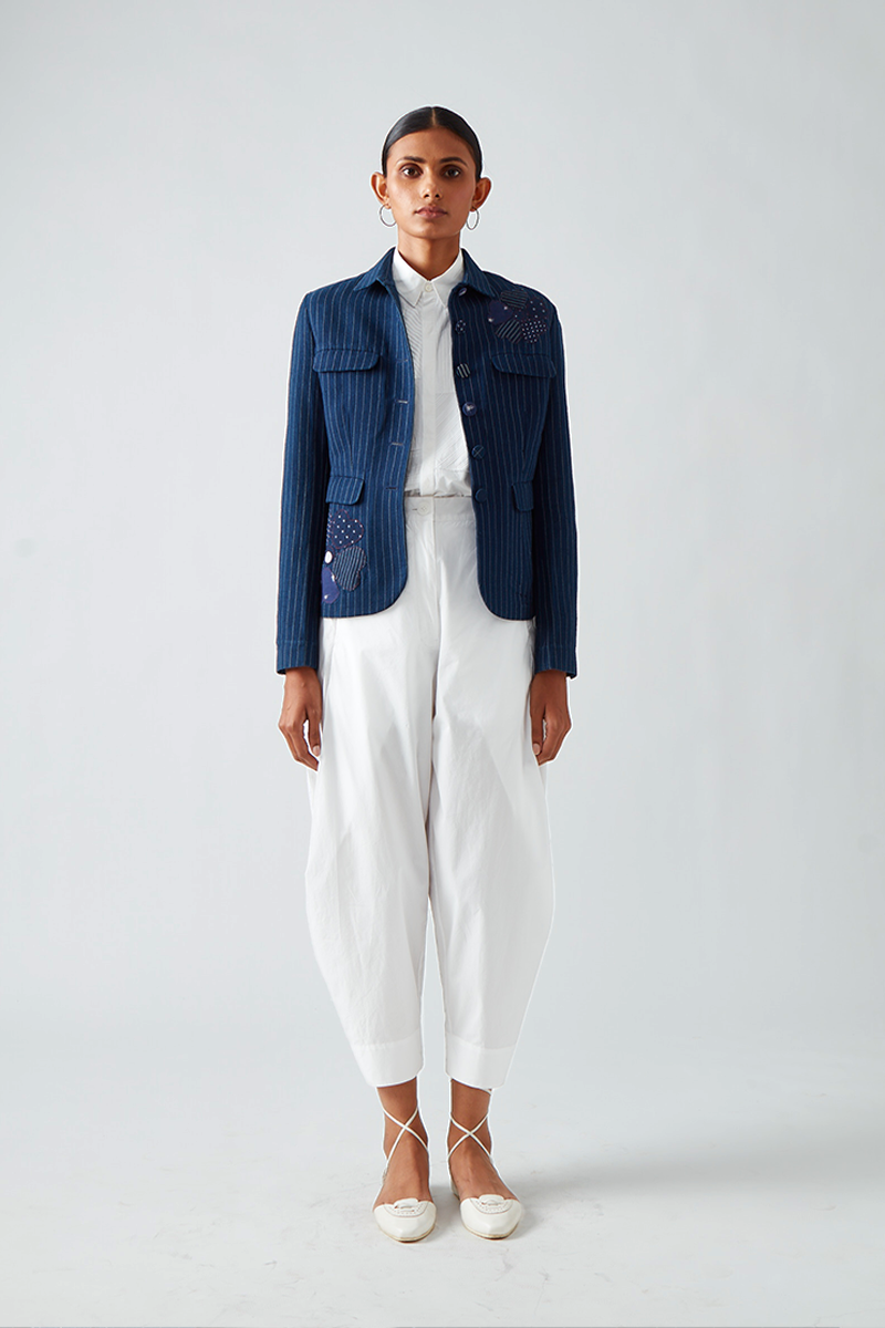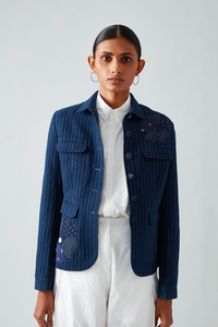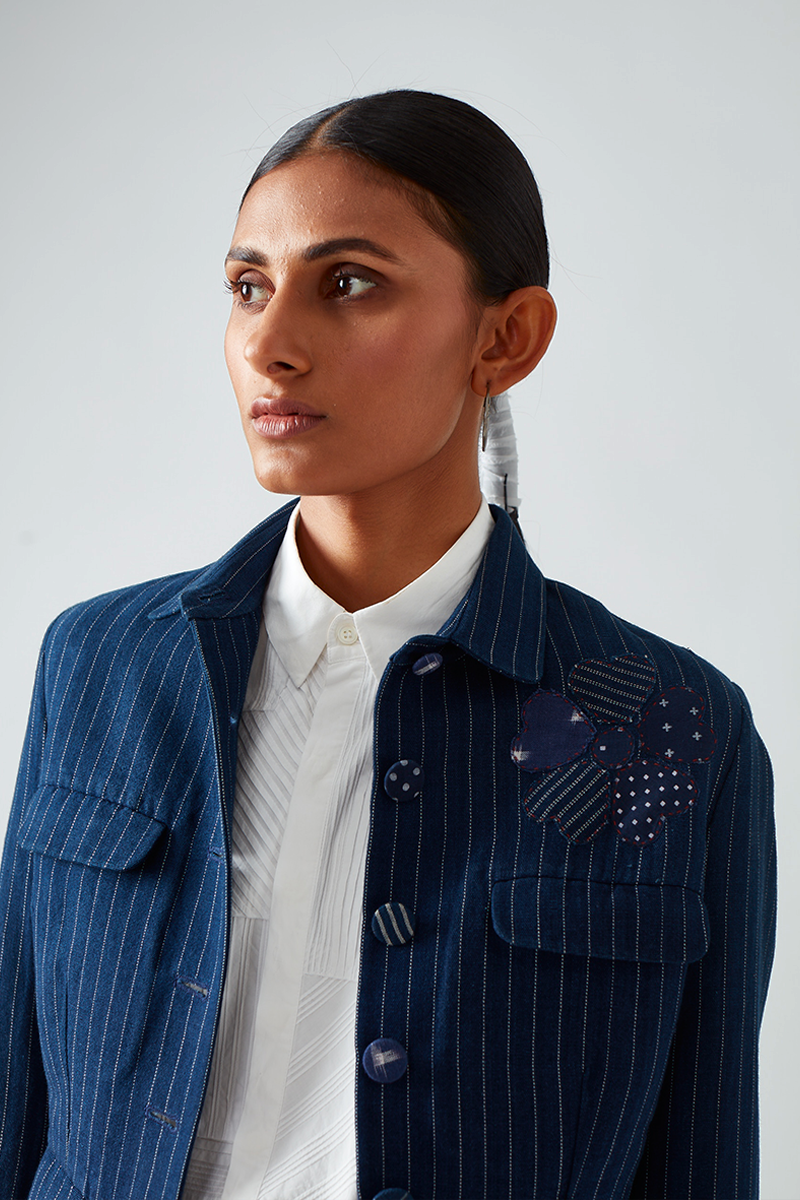 Our Baredi jacket is crafted in handloom stripe cotton and adorned with floral applique, using patchwork fabric.