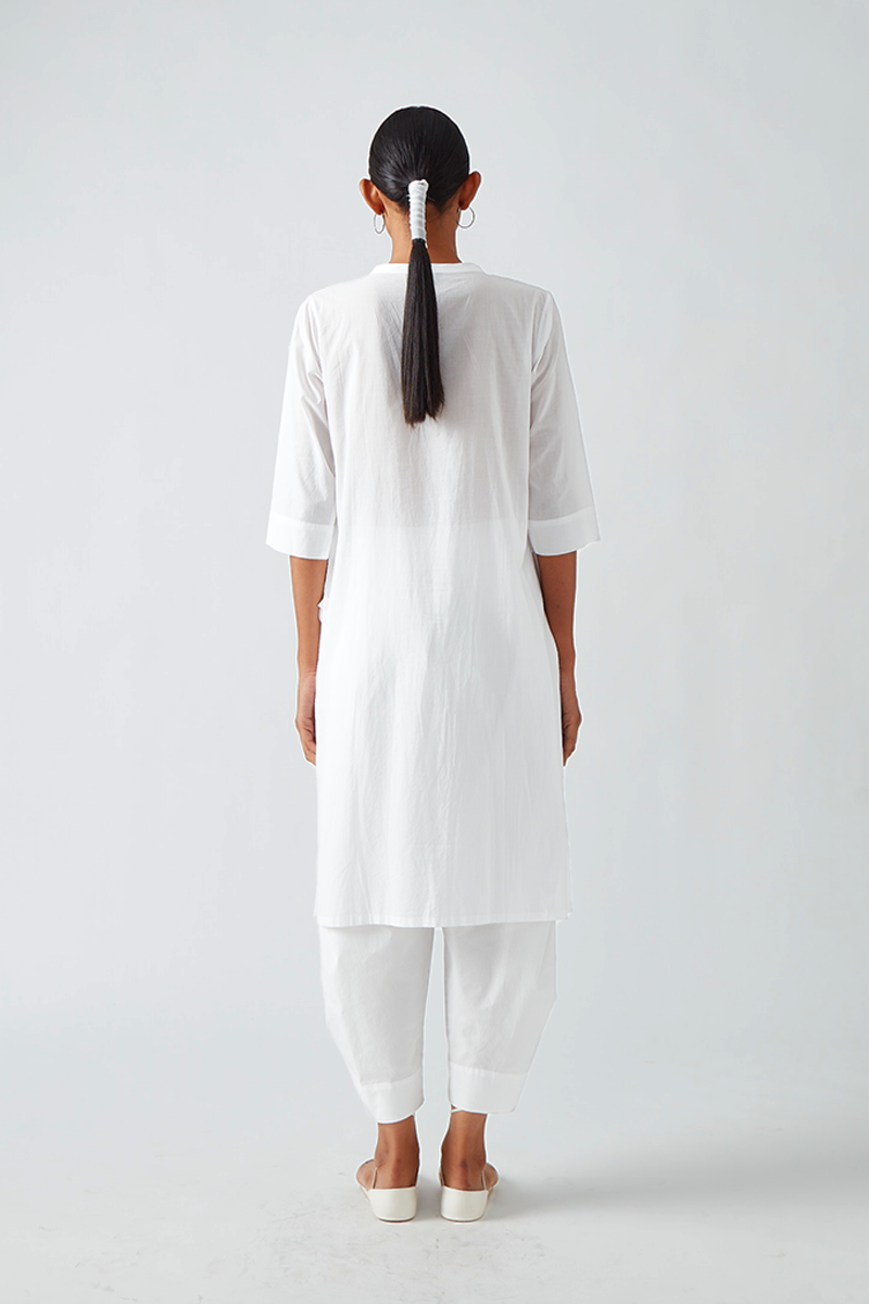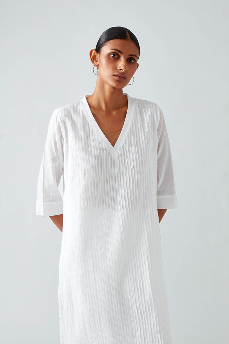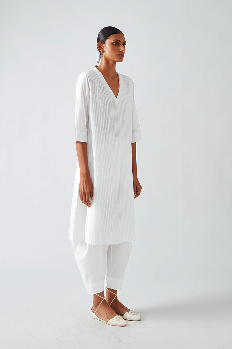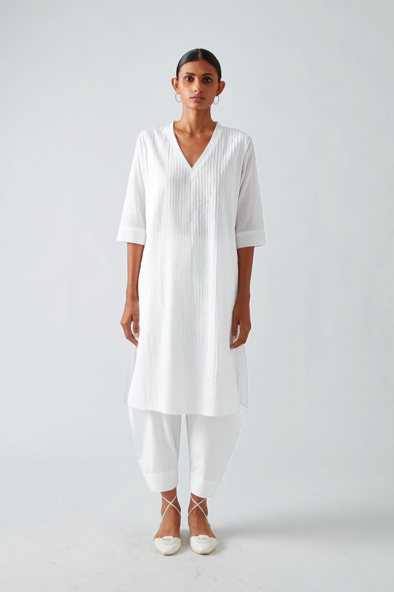 Our Bhaniyana Pintuck Kurta features alternating pleat and pintuck, V-neckline and open sleeves.