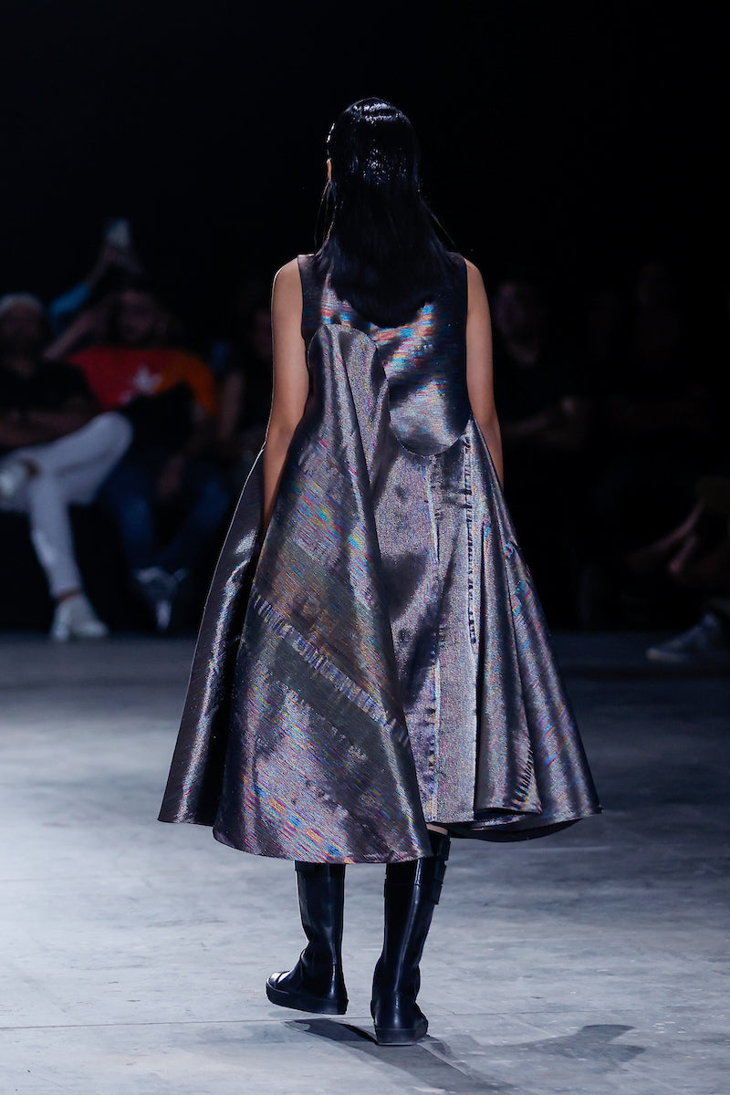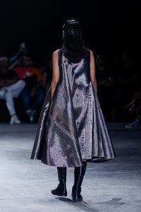 Our Cadenza sleeveless dress is crafted from Irredescent Sylko metallic yarn.
