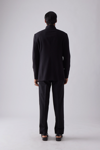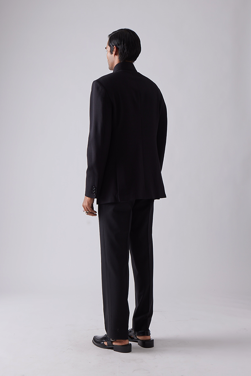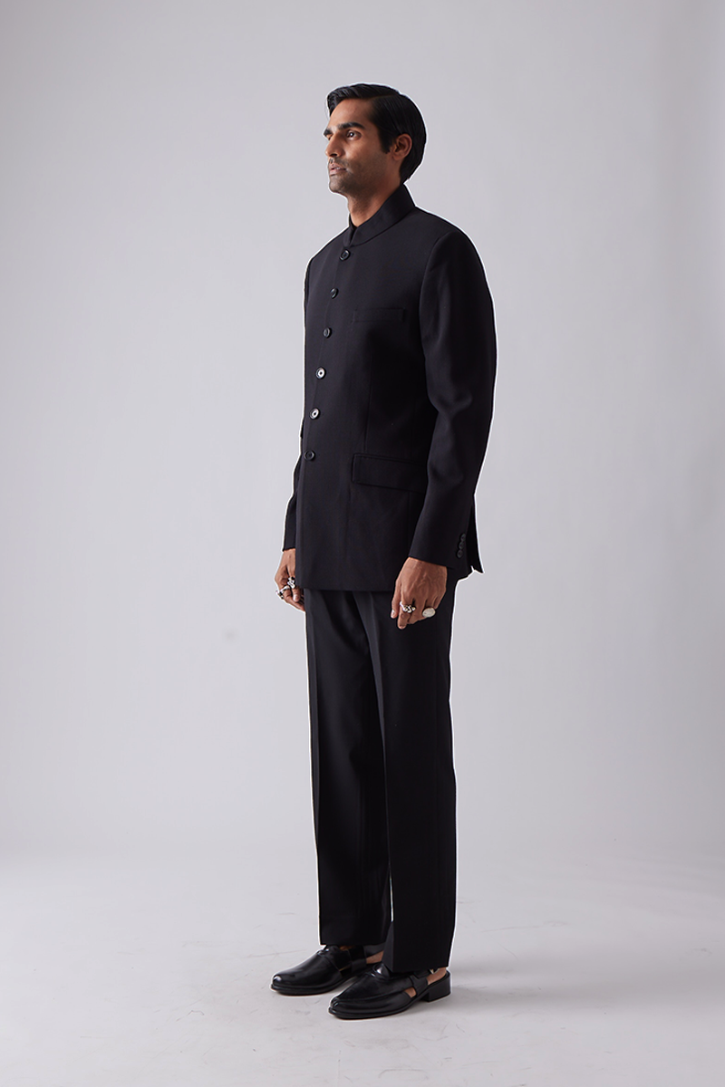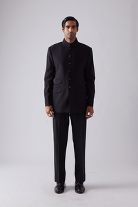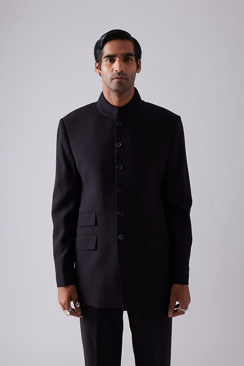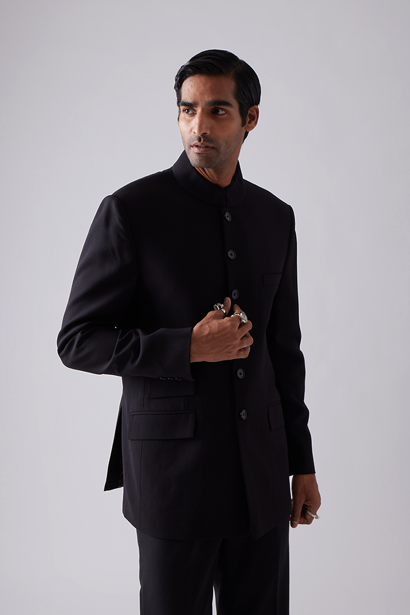 Our bandhgala features a closed hook collar with tonal piping and features two flap pockets and a welt pocket.