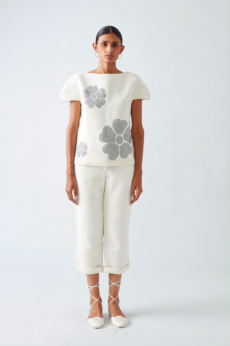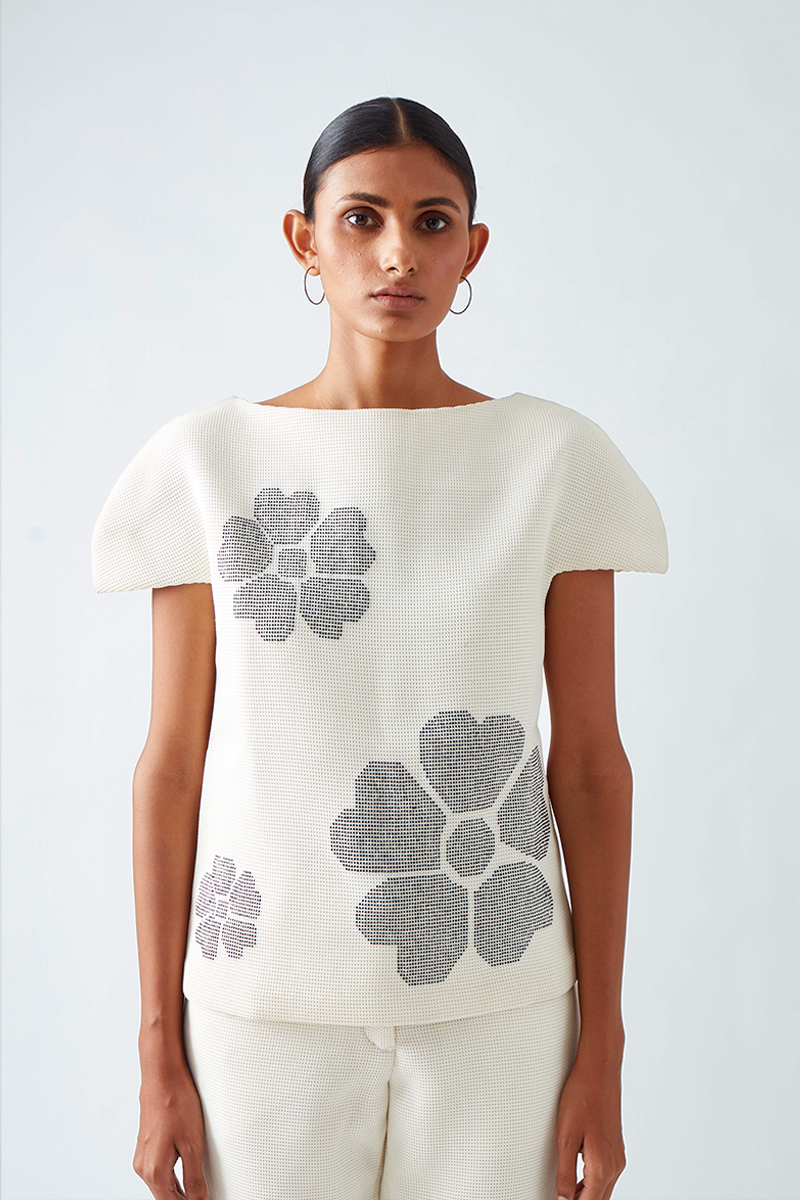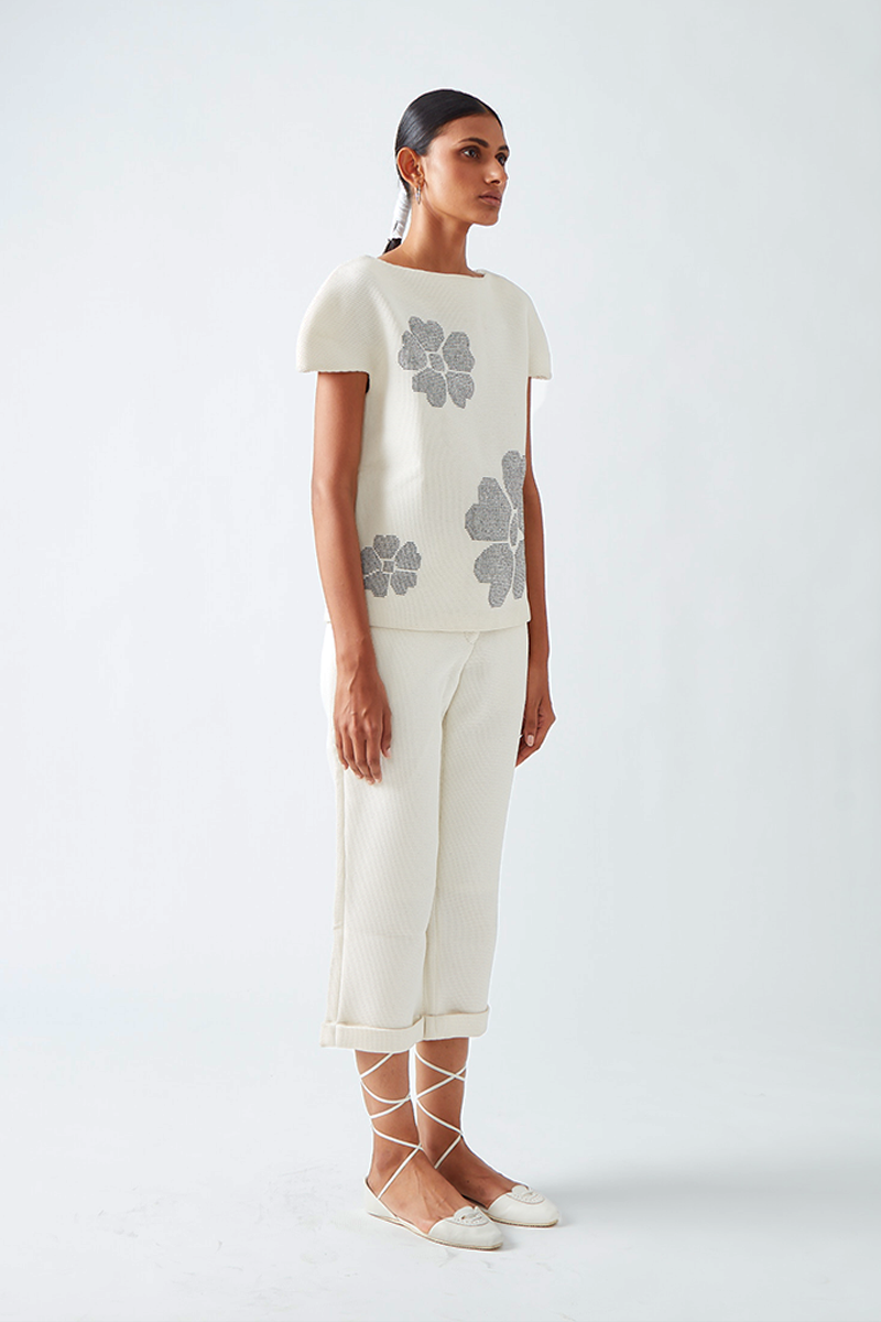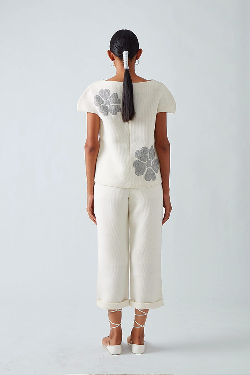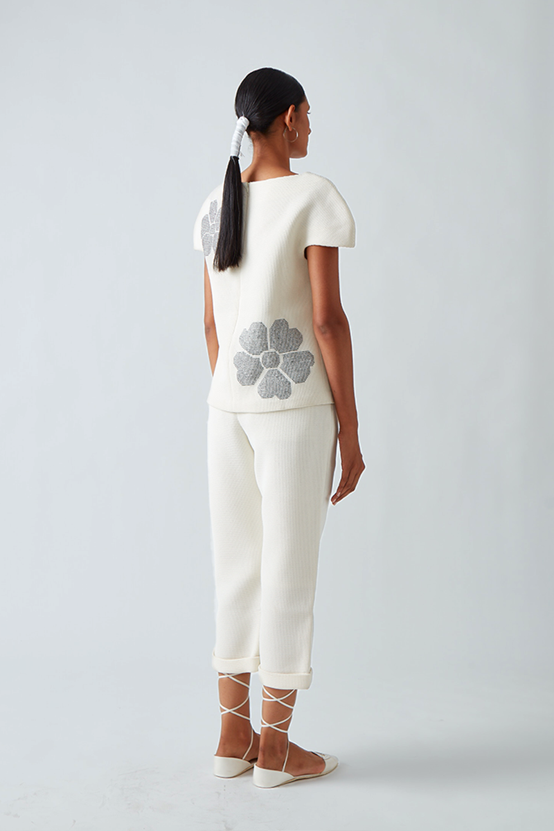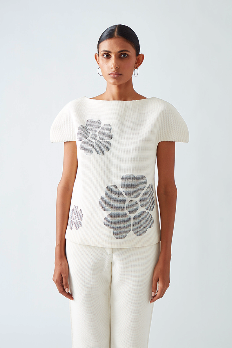 • Our Dora boxy neoprene top is embellished with contrast beadwork forming delicate placement flowers.