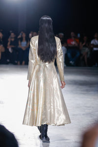 • Our Eclisse front-open, ankle-grazing jacket is crafted in Sylko Metallic, featuring a concealed button placket.