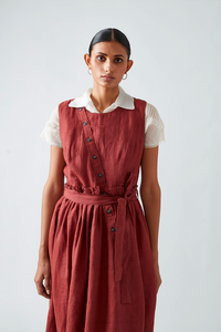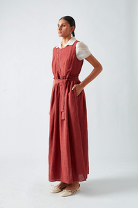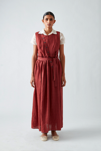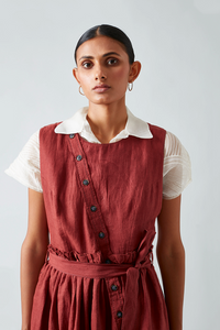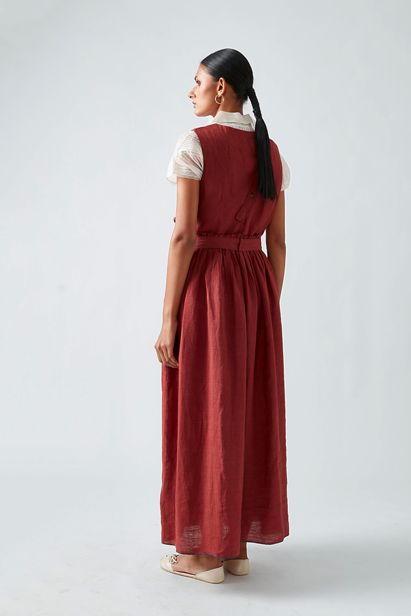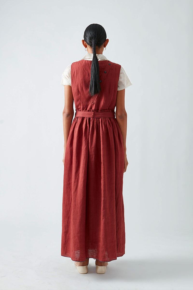 Our Indragarh sleeveless ankle-length dress features asymmetric button placket, soft gathers at the waist, and a belt for definition.