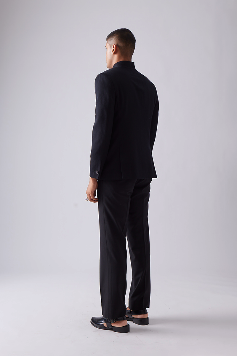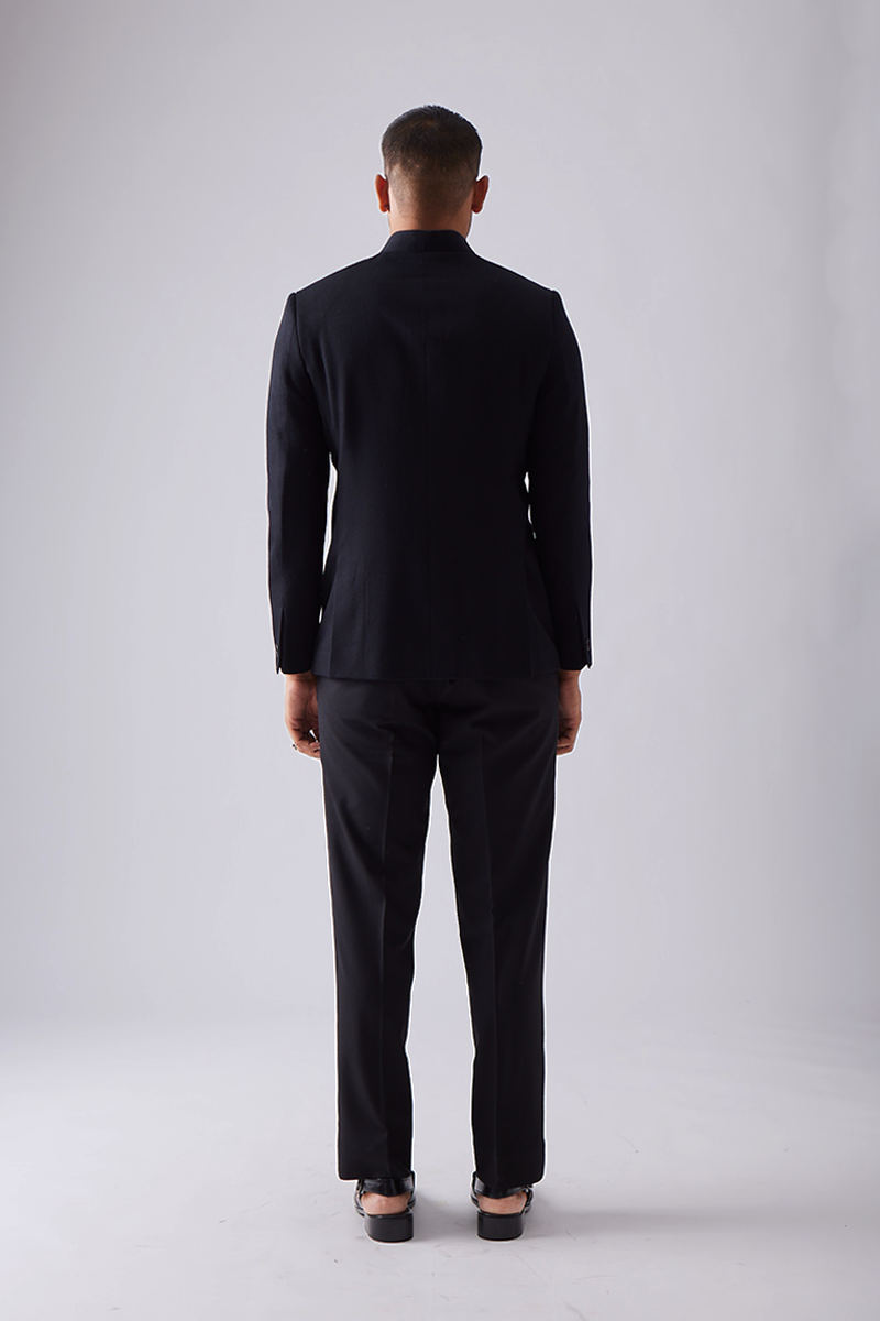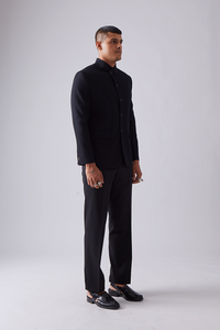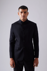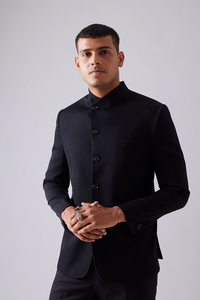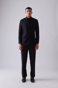 Our bandhgala features a closed hook collar with tonal piping and features two flap pockets and a welt pocket.