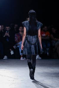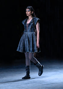 Our Pit V-neck dress features exaggerated shoulders and contrast suture seam detailing.
