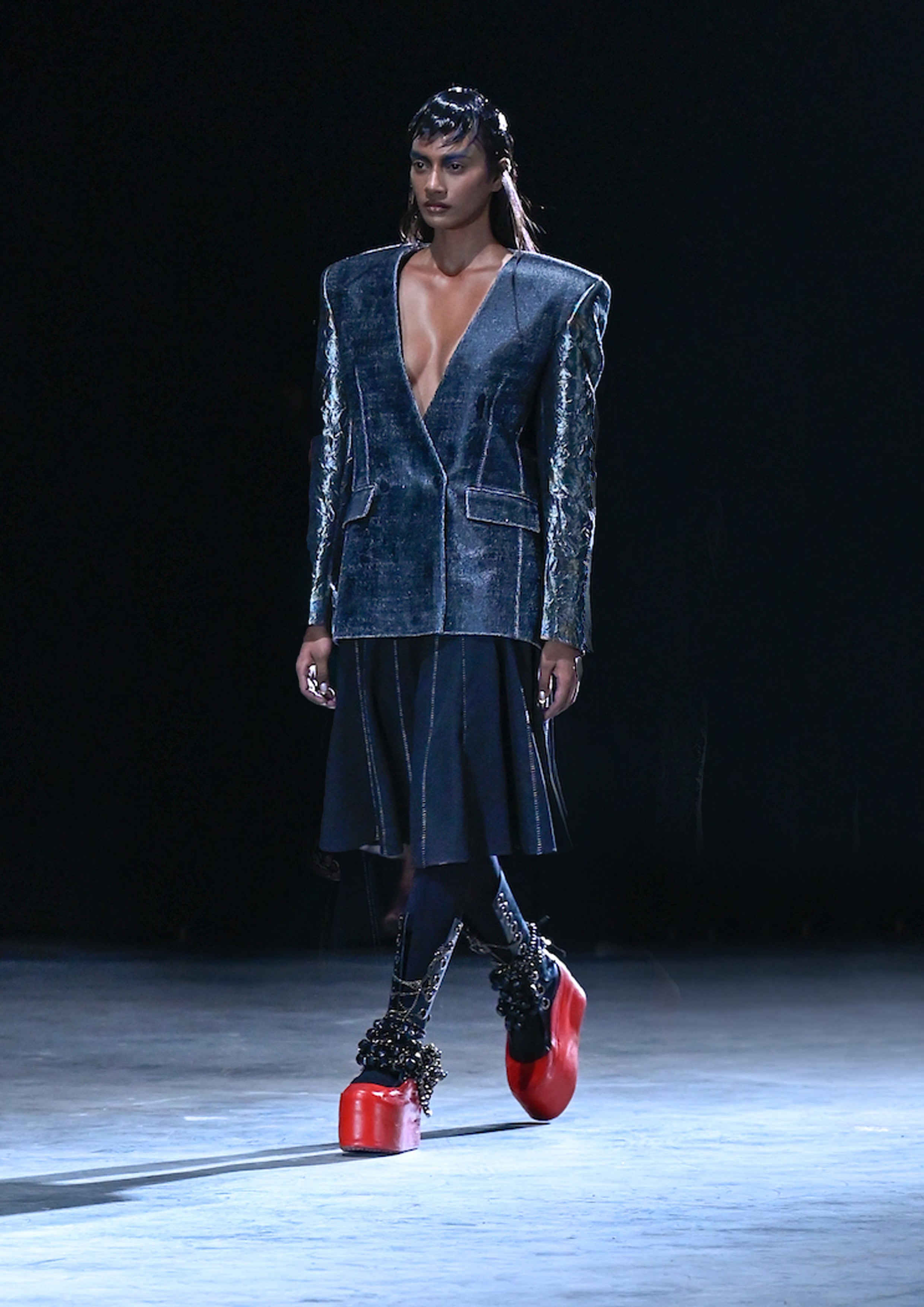 Our Preludia V-neck double-breasted jacket crafted from coated textured slub cotton, featuring exaggerated shoulders, metallic sleeves and intricate suture seam detailing for a bold, structured silhouette.