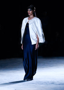 Our Scala full-length satin dress features a draped drop neckline and delicate metal chain straps.