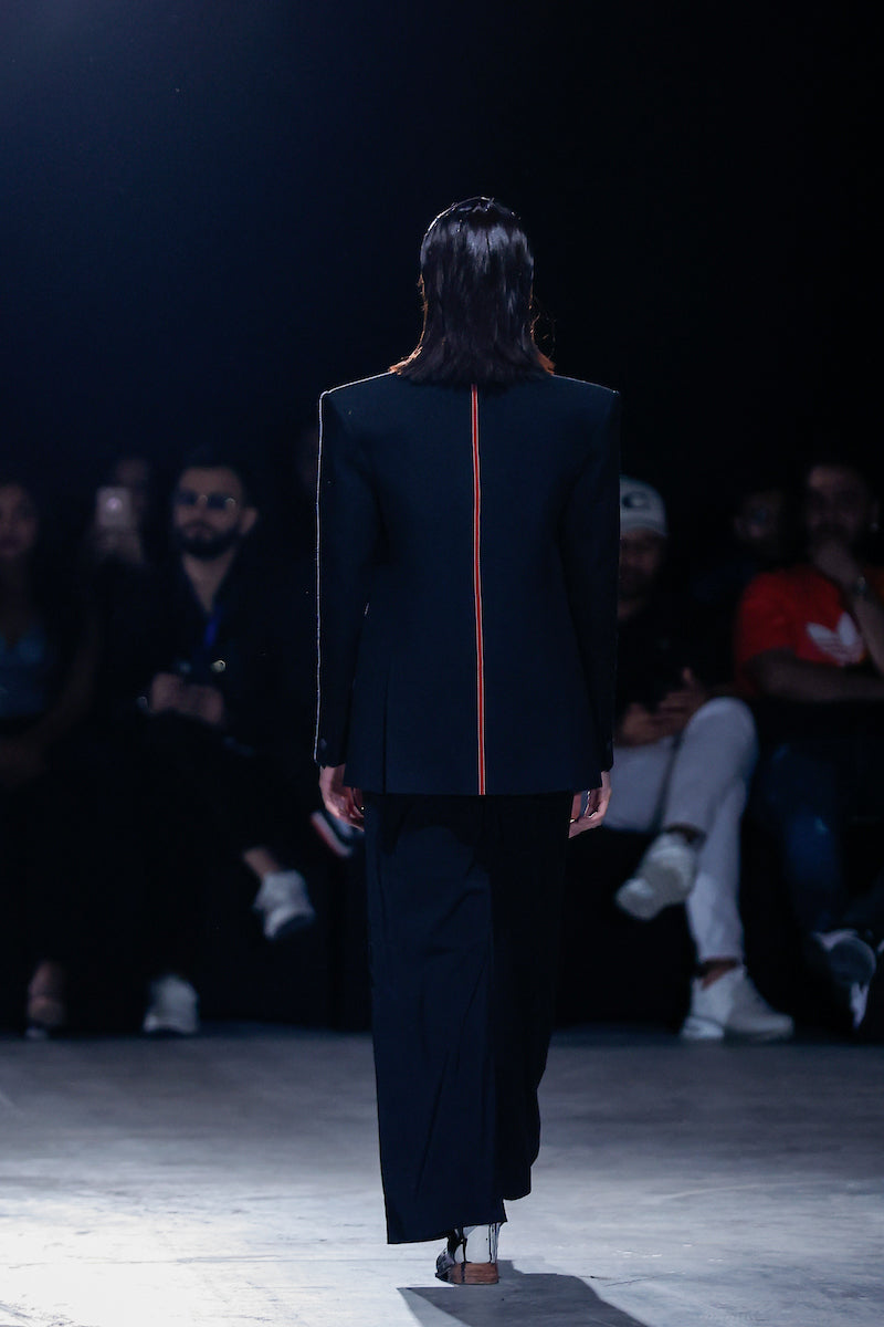 Our Scenetta Exaggerated shoulder double breast jacket crafted in handloom waffle wool with signature red selvedge at the center back.
