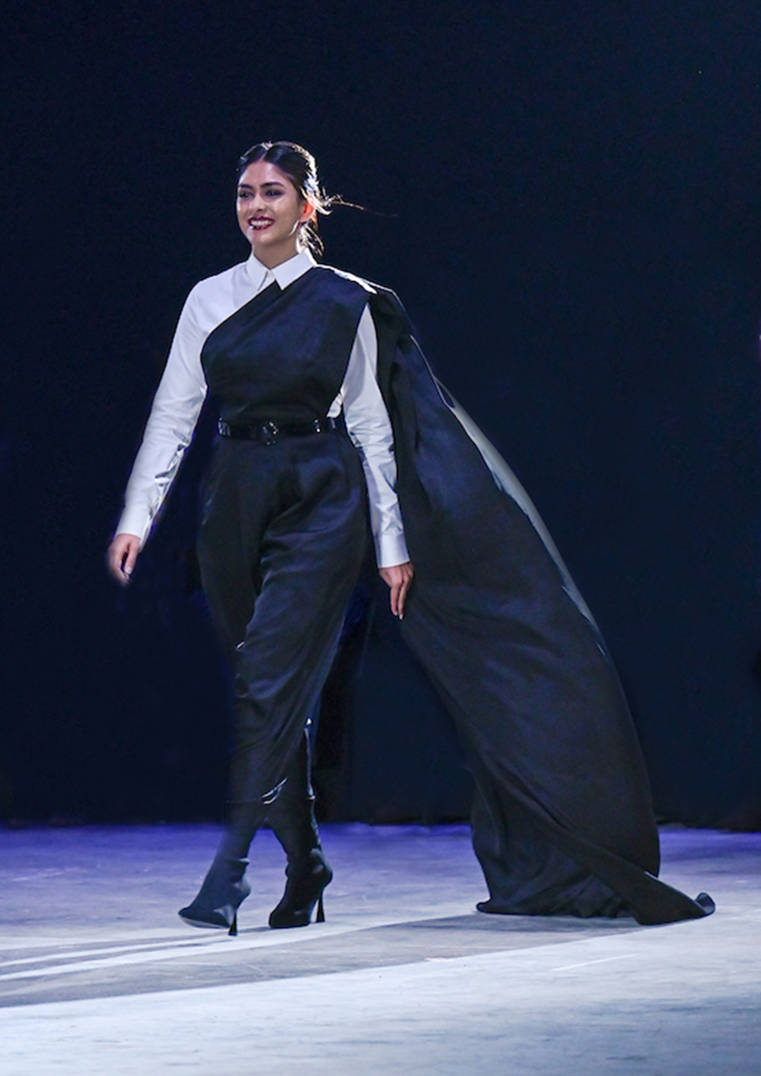 With clean lines and fluid structure, it merges the elegance of a saree with the ease of tailored pants-bold, sleek, and designed for the present moment.